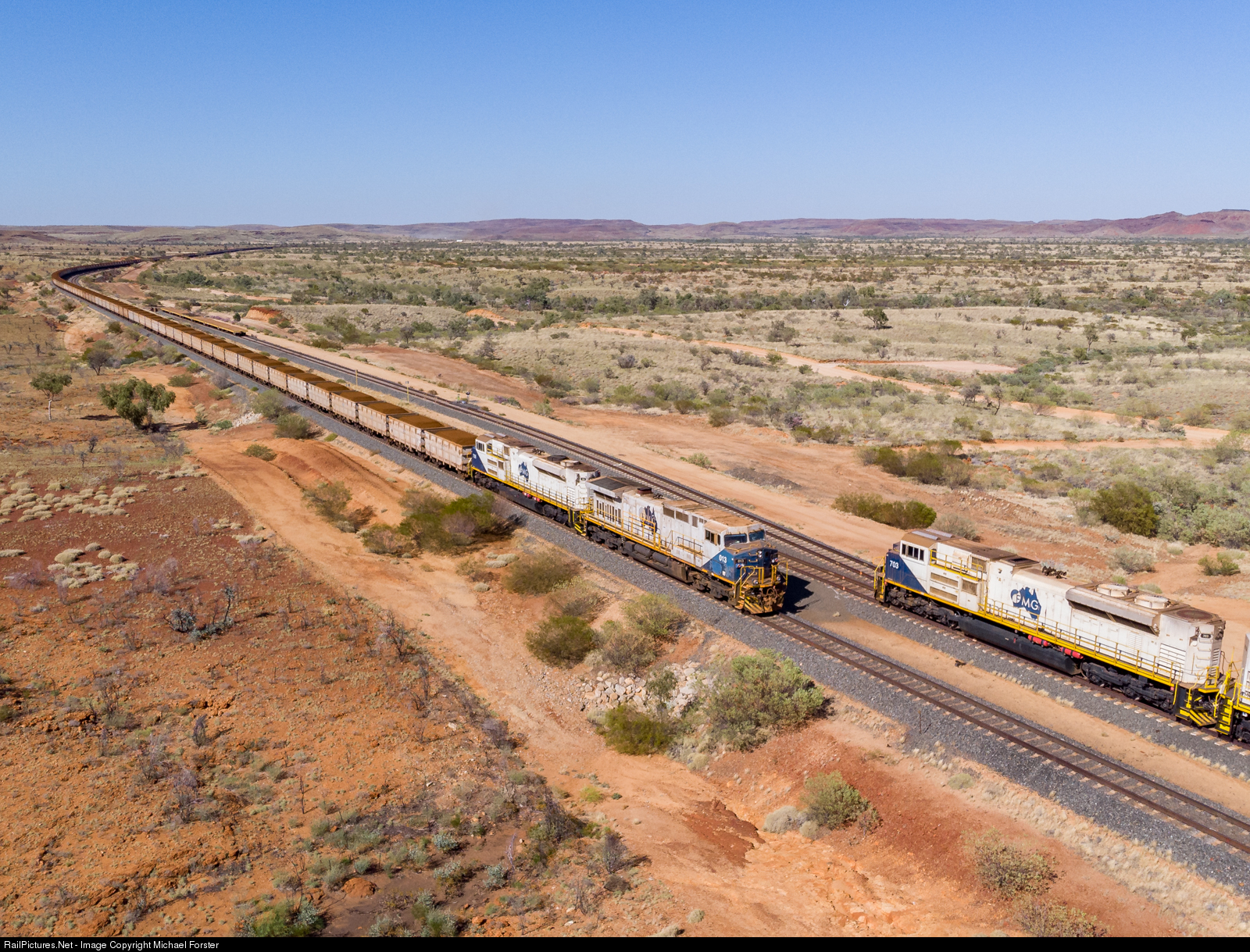 FMG trains cross at Avon. The loaded train has a C44-9W and SD70ACe with the empty using a pair of SD70ACe locomotives. Both these trains will be using Kings/Firetail.