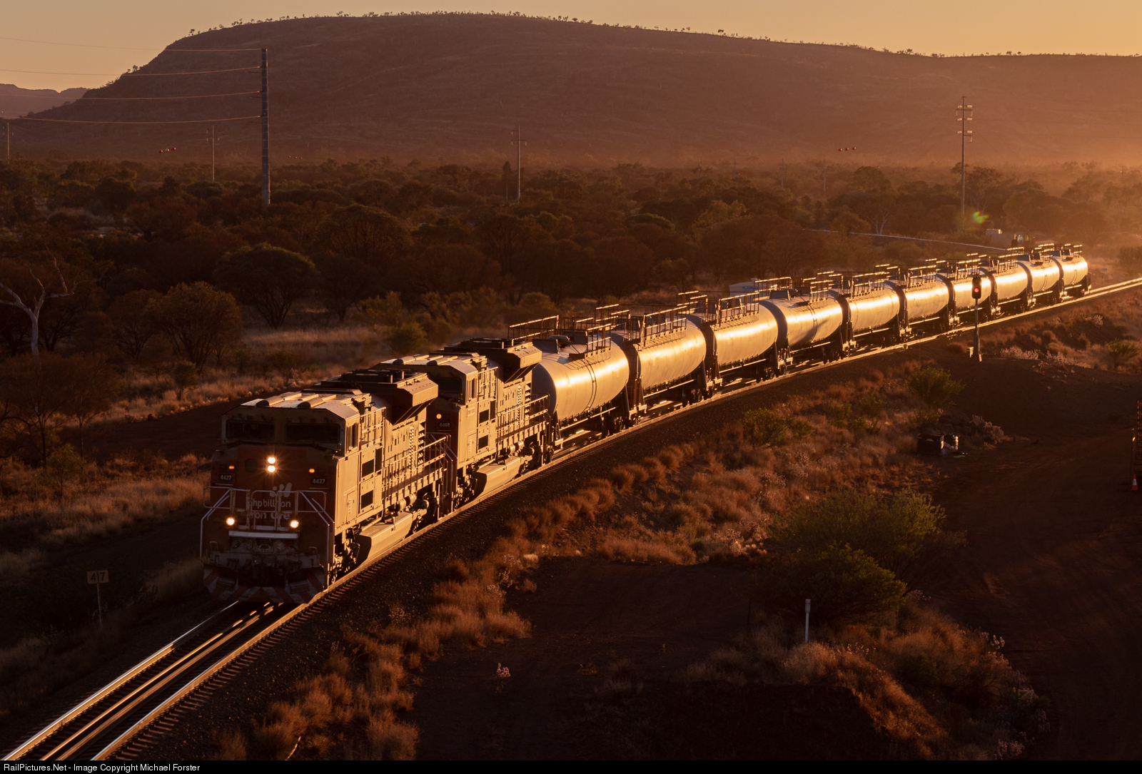 | 2 SD70ACe locomotives arrive at Mt Newman with a loaded diesel fuel train. All minesites in the Pilbara have fuels delievered via rail from the port cities. But these can be problematic to photograph as crews are rostered on these at 1800, generally. |