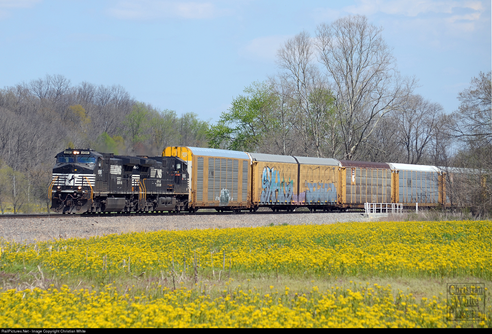 NS 9596 leads an auto rack train west on the former Southern main line en route to the Toyota manufacturing facility in Princeton, Indiana.
