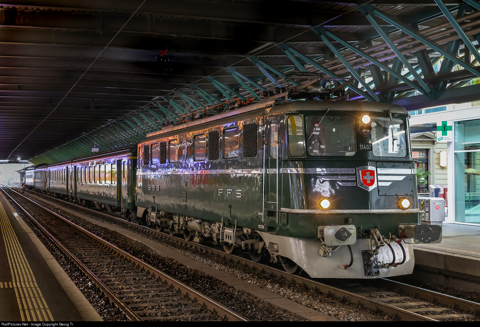| Gotthard locomotive Ae 6/6 # 11407 "Aargau" of SBB Historic, on loan to and operated by association Mikado 1244 in Brugg AG, with a charter train of Eurovapor from Wil SG via Winterthur-Zürich to Brugg AG. The cars were then pulled by steamlocomotive 141 R # 1244 on the western part of Switzerland roundtrip of this day. |