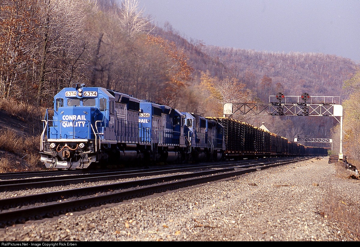Bethlehem to Conway symbol BEPI growls up the grade past MG interlocking on a November afternoon with its typical head-end consist of truck frame traffic out of Reading, PA. A pair of SD40-2 helpers lead the road power; another pair on the trains' rear-end. Ektachrome.