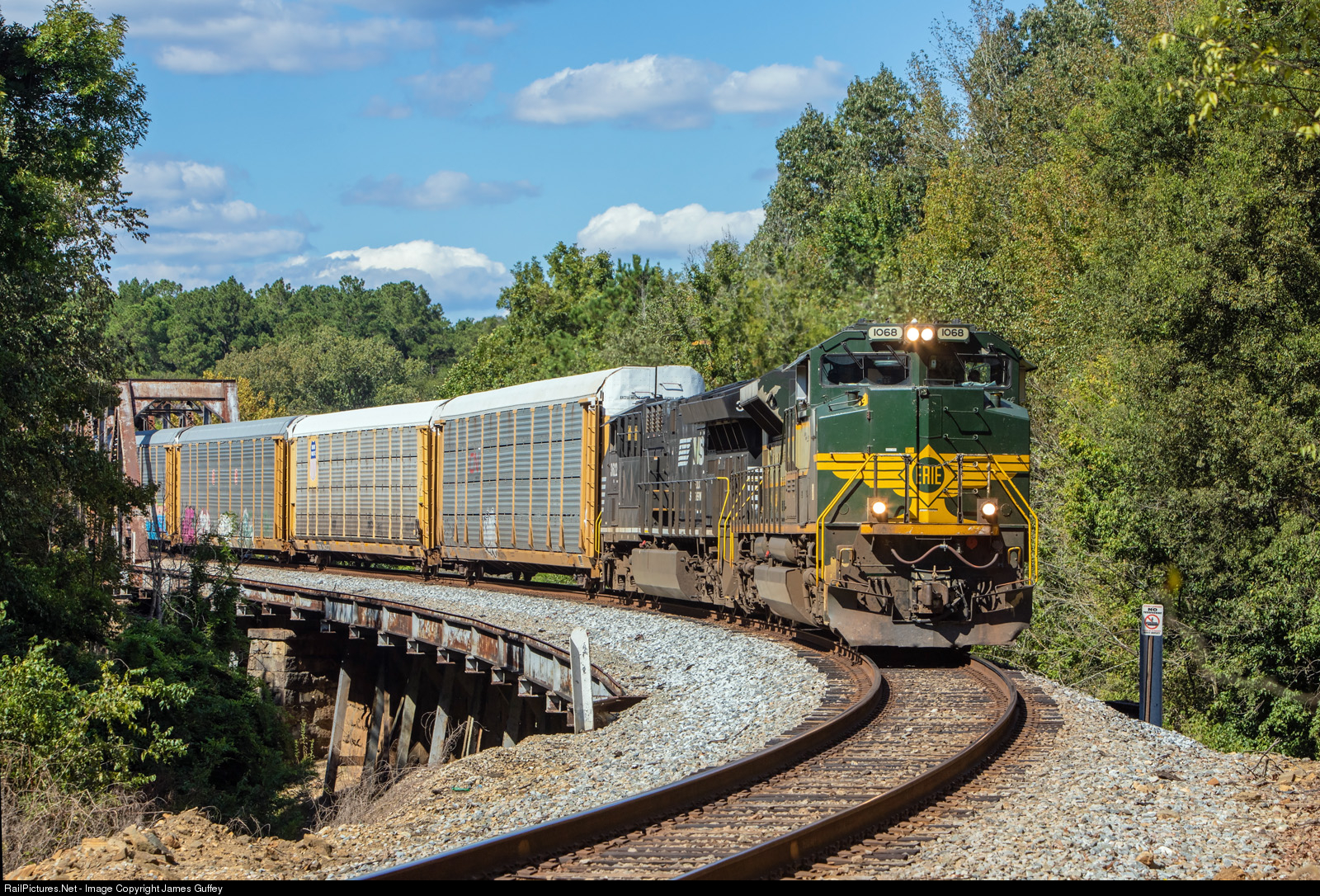 | The Erie heritage unit leads 10T at the remote Broad River crossing at Shelton, SC. The train has slowed to about 25 mph to negotiate some sharp curves on the approaches. 10T will follow the Broad River closely for the remainder of its journey to Elmwood Junction in Columbia. |