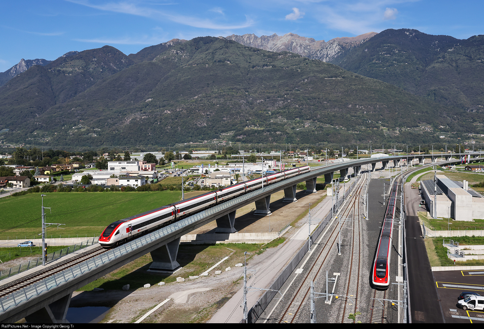 The new 15,4 kilometer long Ceneri Base Tunnel (CBT), part of the NEAT (Neue Alpen Transversale/New mainline through the Alps), was officially inaugurated on september 4th, and now during the day all Intercity and Eurocity trains are using this new base tunnel from Camorino to Vezia and vice versa below the Ceneri pass. During the night, there are first freight trains diverted through the tunnel. Full mixed freight and passenger service will start by no later than change of timetable in december. ICN tilting train RABDe 500 # 003 just left the tunnel near Camorino and is running over the long curved bridge towards Giubiasco, running the IC 10870 (IC 870) from Lugano via Bellinzona-Arth Goldau-Rotkreuz-Zug to Zürich, while another ICN RABDe 500 is entering the tunnel shortly, running as IC 10667 (IC 667) from Basel via Olten-Lucerne-Arth Goldau-Bellinzona to Lugano. This is a compilation of two shots about 12 minutes apart.