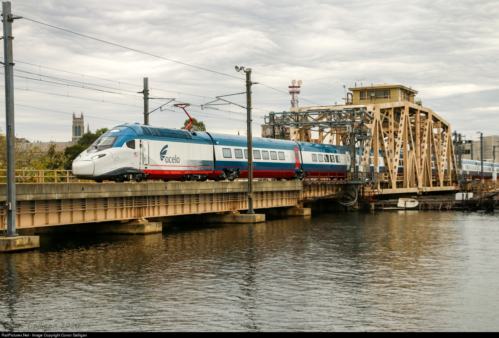 Amtrak Alstom Avelia Liberty Equipment Extra 855 crosses the Shaw's Cove Moveable bridge just before the sky opened up to torrential rain. This move was bringing the trainset back to Philly.