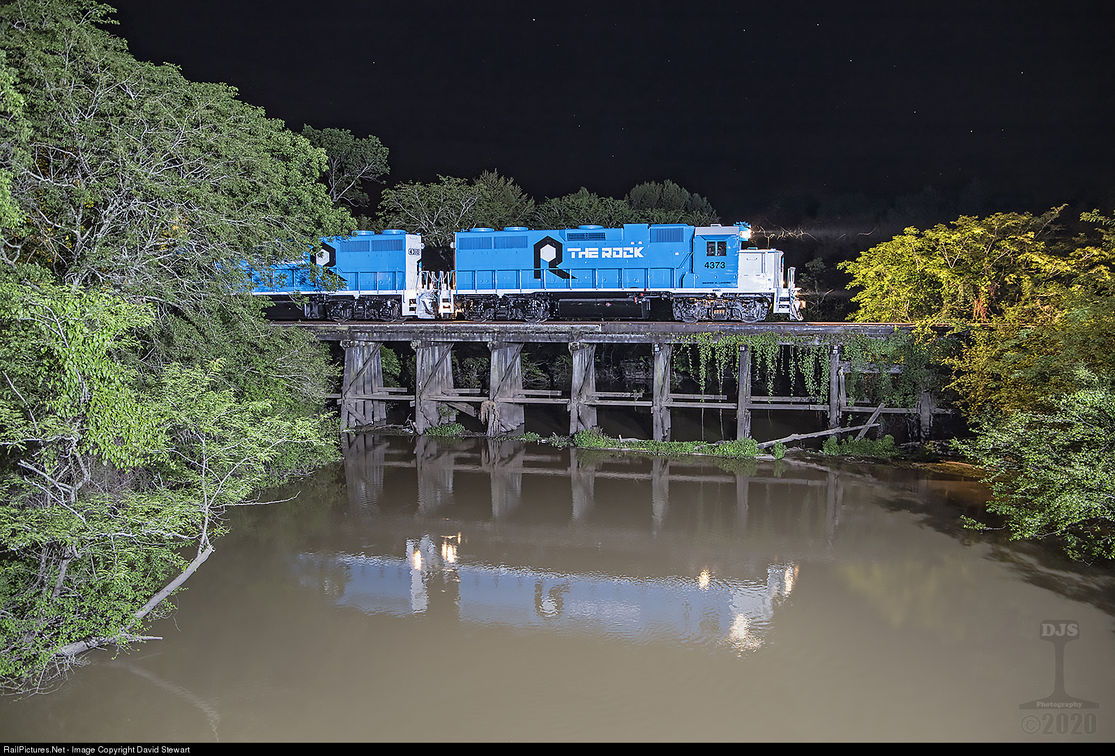 The Rock's freshly painted GP38s are just north of Swan Lake, Mississippi as they stand over the Little Tallahatchie River during an evening photo shoot on May 23, 2020.