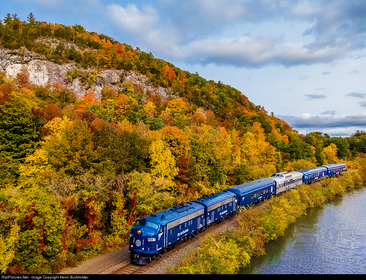 A westbound Pan Am Railways Office Car Special train, OCS-27, is seen rounding a very colorful curve at Pownal, Vermont, along the Hoosick River. The train 4-car train is led by the 'executive F's' that seemingly have an extended lease on life with the prolonged full implementation of PTC on the PAR eastern Massachusetts routes.
