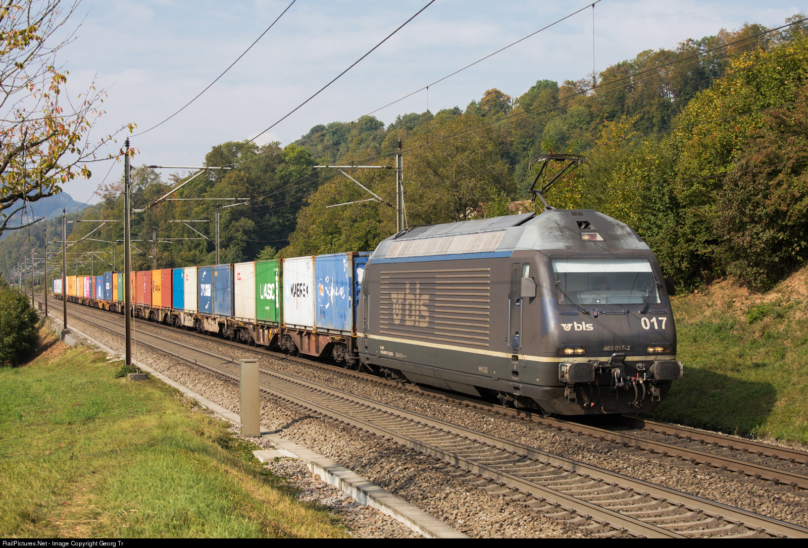 | The extremely dirty Re 465 # 017 of the BLS (the color should by dark blue and not brown/black) is pulling the container train 42675 from Neuss/Germany to Niederglatt, on the Bözberg south ramp between Schinznach Dorf and Brugg, near Umiken, |