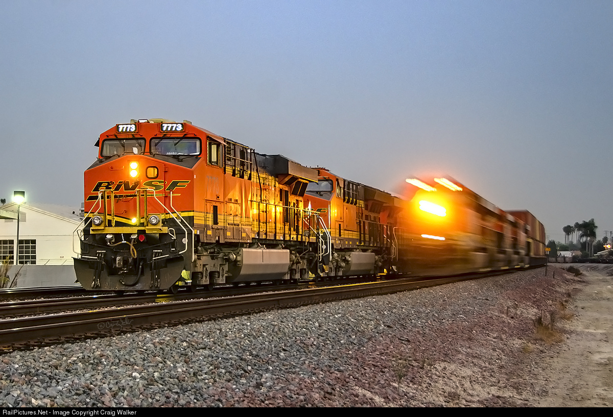 Just after sunset on another smoky day in the Western US, BNSF Railway train H-BARWAT1-12 (High Priority Merchandise, Barstow to Watson) is about to get overtaken by a higher priority westbound (the S-LPKSCO1-09, Intermodal Stacks, Logistics Park Kansas City KS to Long Beach CA). The BARWAT, with BNSF ES44DC 7773, ET44C4 3721 and BNSF 7729 for power (with BNSF ET44C4 3752 and 3745 on the rear) has been sitting at Basta, about a mile west of the Fullerton Amtrak station, for well over an hour at this point, having met or been overtaken by at least six BNSF, Amtrak and Metrolink trains. The S-LPKSCO has BNSF ES44AC 6041, ES44DC 7013, ES44AC 6171 and ES44C4 7114 on its headend. (Fullerton, California – September 12, 2020)