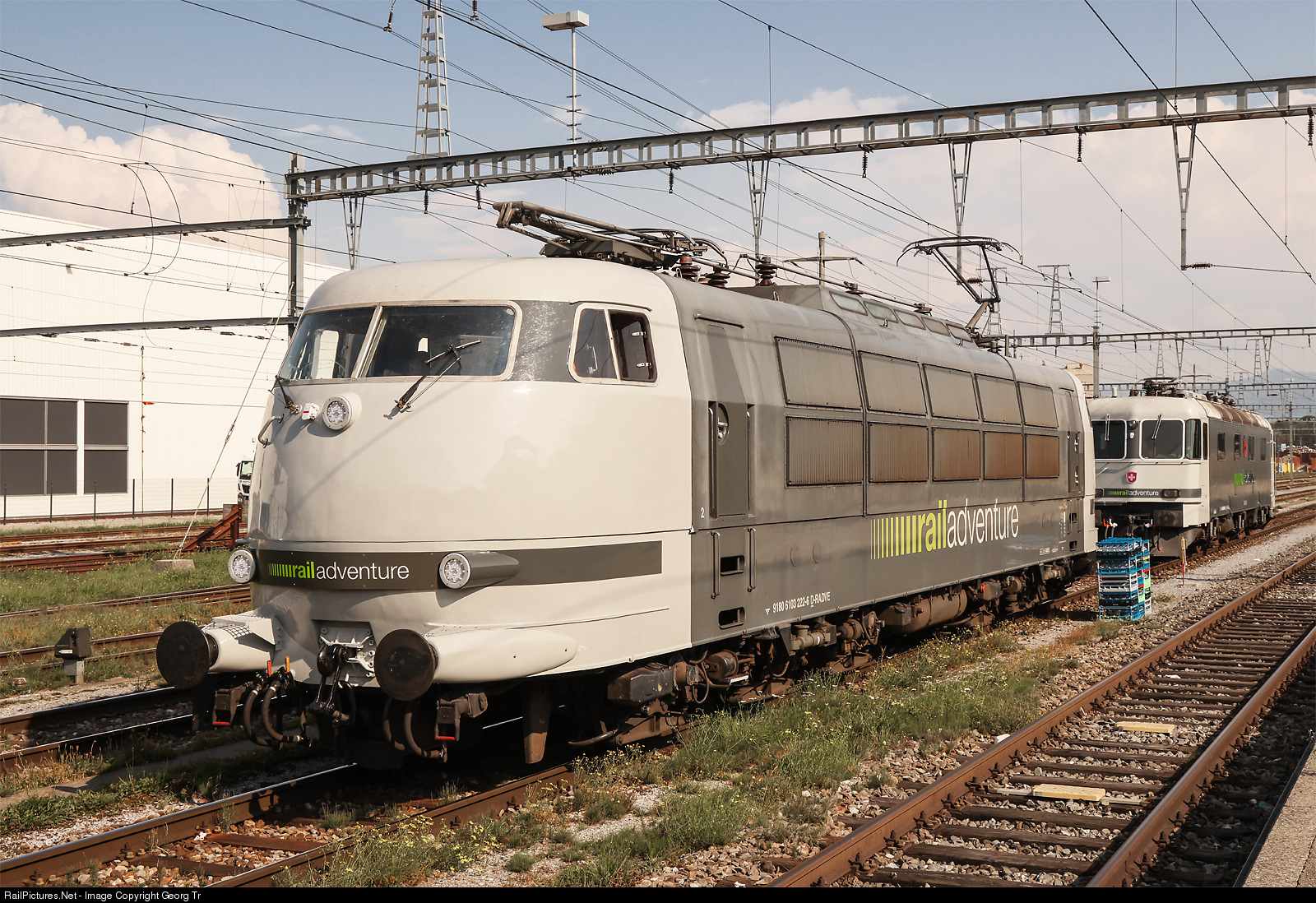 | Former Deutsche Bahn express train locomotive 103 # 222 of Railadventure, allowed to run 280 km/h, in St.Margrethen on a short visit in Switzerland. The 7780 kW locomotive was used as test locomotive 750 # 003 by Forschungs- und Technologiezentrum/DB Systemtechnik, after she was withdrawn from regular service in 1989. Since 2015 owned by Railadventure and with revision and new paint in Dessau. In the background is Re 620 # 003 of Railadventure, former Re 6/6 # 11603 prototype of the SBB. |