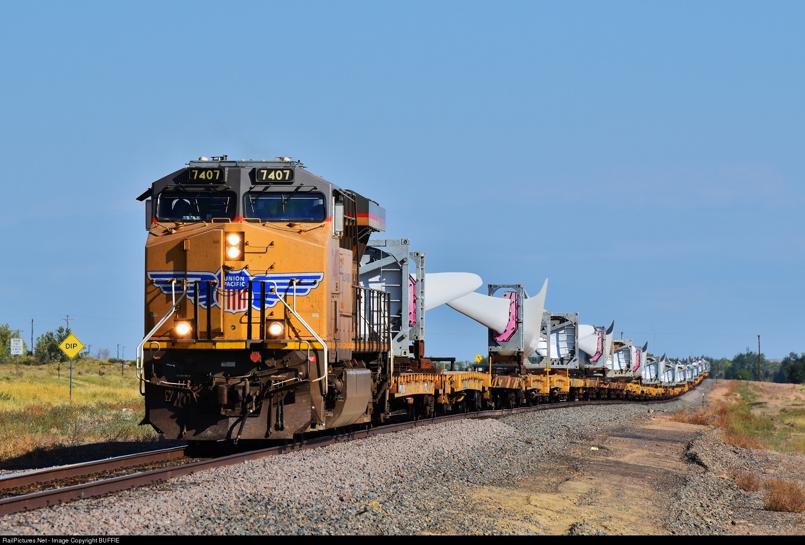 UP 7407 (ES44AC) pulls a wind mill blade train towards Pueblo, Colorado on the Joint Line.