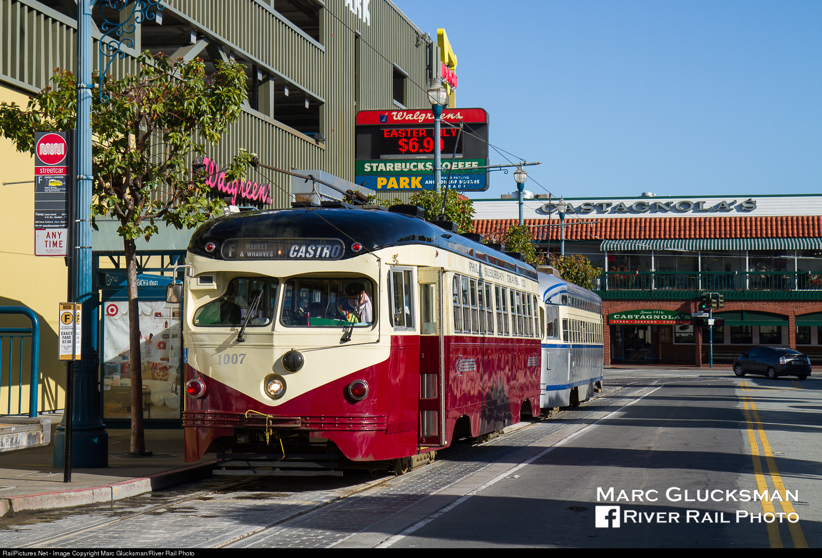 A dated photo under the wire. On April 4, 2012, San Francisco Municipal Transportation Agency/Market Street Railway 1007 (Red Arrow/Philadelphia Tribute) was operating in F/Market Street Line service as it turned the loop at Jones Street in San Francisco, California. This was an original SF car, but was repainted as part of the programed of "Historic Streetcars in San Francisco" that have populated both the E and F lines since 1995. While the Red Arrow did not own actual PCC cars, it did have St. Louis built cars with an extremely similar optical design that operated on the 103 (Ardmore) and 104 (West Chester) lines through their conversion to bus in the 1960s and until the 1980s on its 101 (Media) and 102 (Sharon Hill) lines when modern Kawasaki cars arrived. Car 1007 is presently out of service.