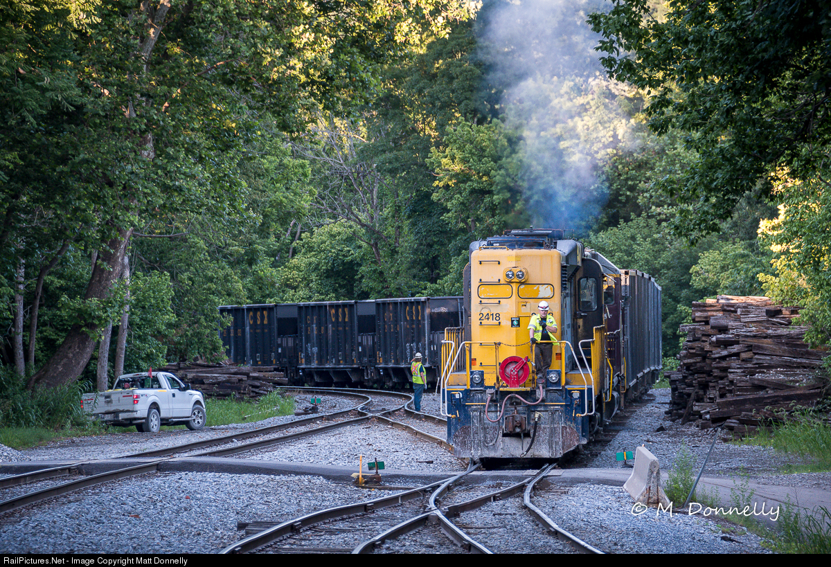 Throttling up with a cut of hoppers to head back into the quarry for assembly and pickup by CSX, these two LTEX EMD's throw up a cloud of blueish-white exhaust.