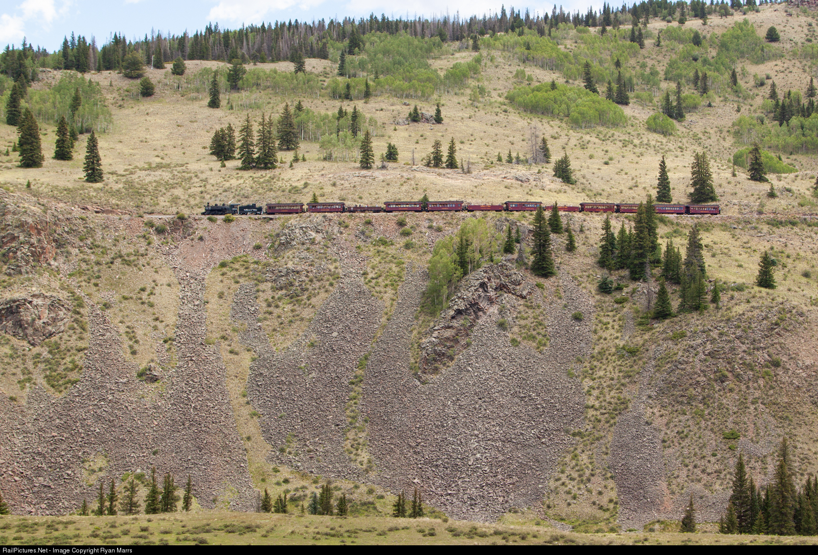 With D&RGW #484 in the lead, the daily C&TS excursion follows a shelf high above the Rio de los Pinos.
