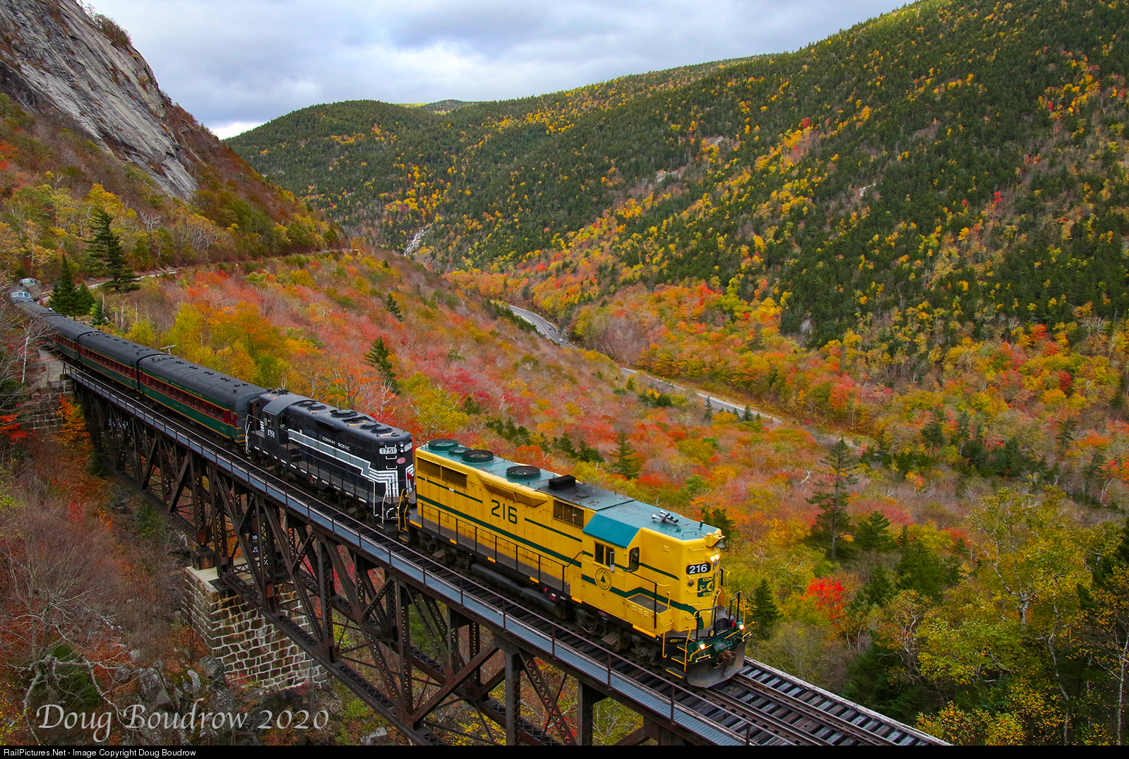 | The Mountaineer is seen crossing the 1906 built, 400 foot long Willey Brook Bridge that spans the gap between Mount Willard and Mount Willey in Crawford Notch. As the second week of October begins, the foliage is already fading. High winds have knocked many of the leaves off the trees. |