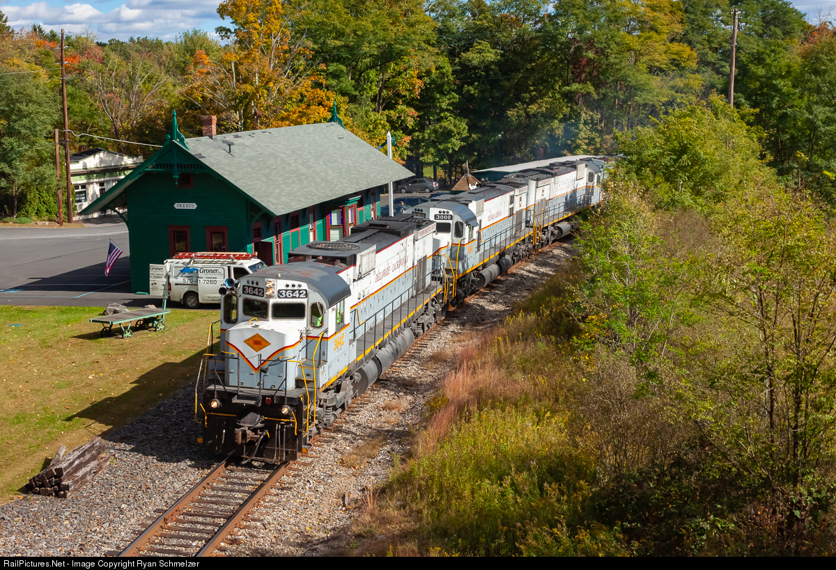| The Delaware Lackawanna PO75, with C636 3642 in the lead, departs Cresco with empty centerbeams. |