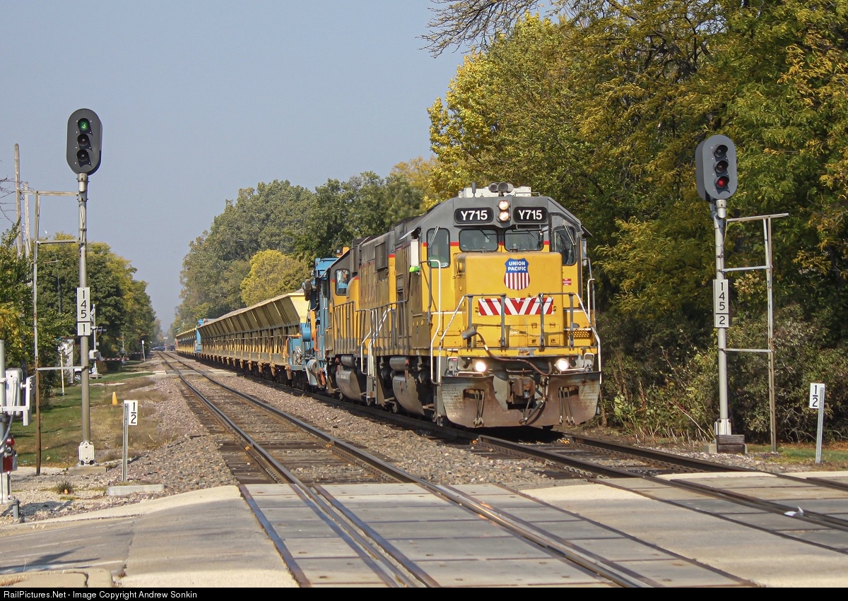 | Union Pacific Yard EMD GP15AC No. 715 leads a 2-set ballast conveyor train south on the Kenosha sub towards Ravenswood whilst splitting the signals at Wilmette. This portion of the Kenosha sub sees zero freight movement so this was something! |