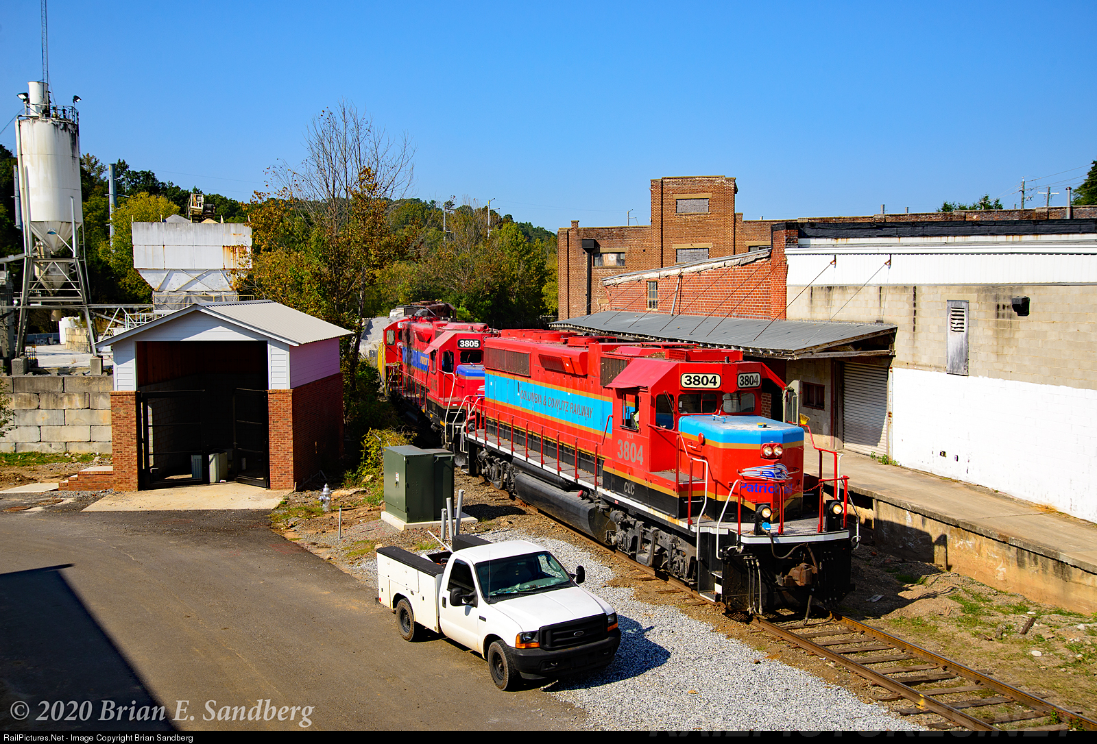 | CLC GP38-3 #3804 and train have been recrewed and are passing the Canton Textile Mill 10/7/20. The crew will run light to Marietta Road, pick up a load and switch out Venture Commodities before continuing South. The former denim mill is being redeveloped as The Mill on Etowah with a brewery and restaurants. |