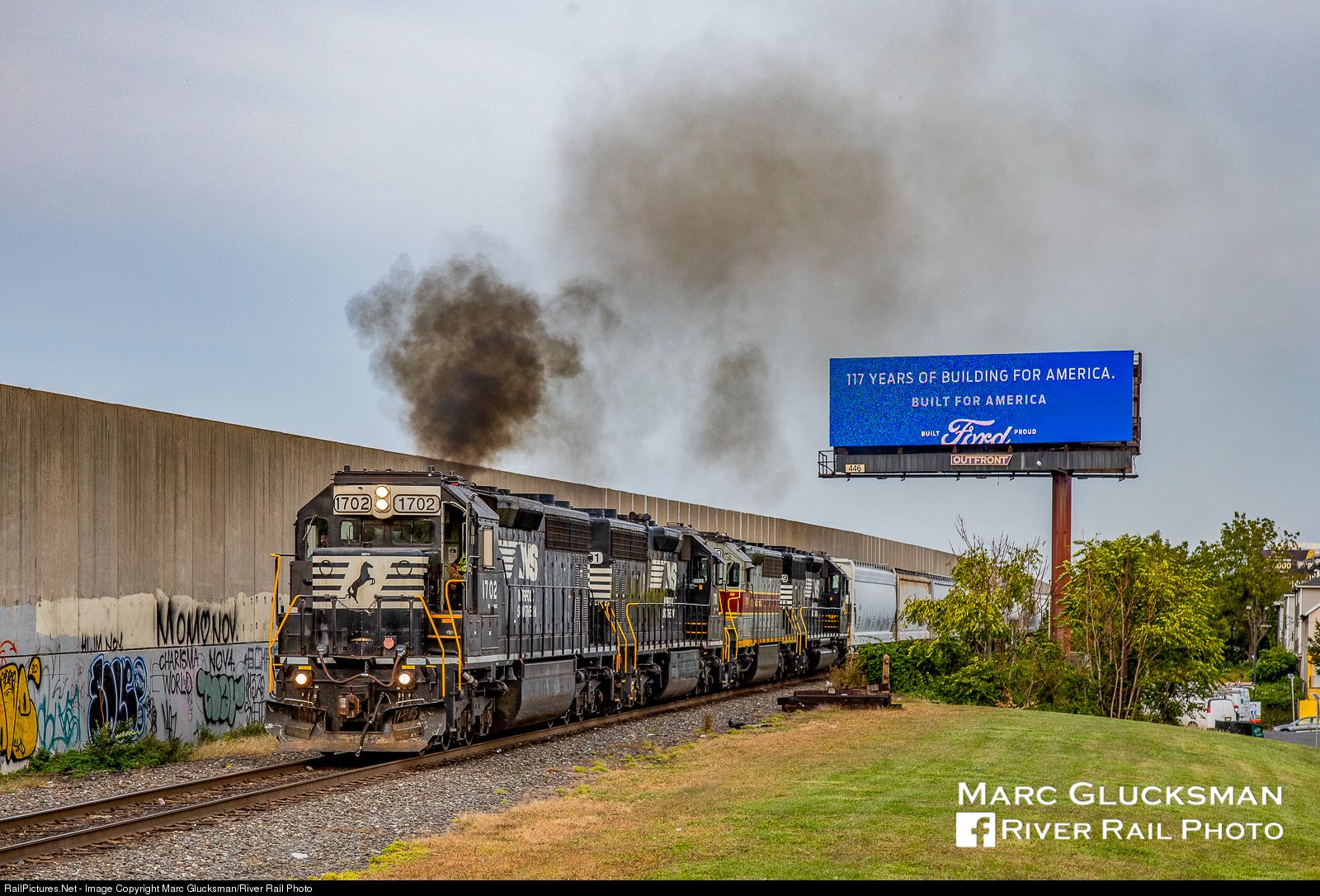 GM to Ford - eat my smoke! Norfolk Southern 1701 (SD45-2) leads a four pack of General Motors owned EMD's finest late 1960s/early 1970s offerings (NS 1702 SD45-2, NS 1700 SD45-2 [EL Heritage], and NS 3429 SD40-2) taking Conrail Shared Assets OI16 down the Chemical Coast Line (Garden State Secondary) on the afternoon of Saturday, October 10, 2020. At the opportune moment, the digital billboard flips to an advertisement for competitor Ford Motors just in time to receive a think plume of black smoke as the engineer notches it up to pull an astounding 135 cars on this usually much more compact local to Browns Yard in Sayreville, New Jersey.