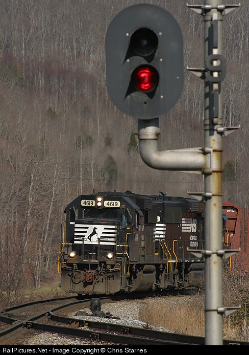 | NS T50 shoving westbound on the mainline as seen framed with the intermediate signal at Duffield, about to drop down into the lumber yard and begin thrashing around. |