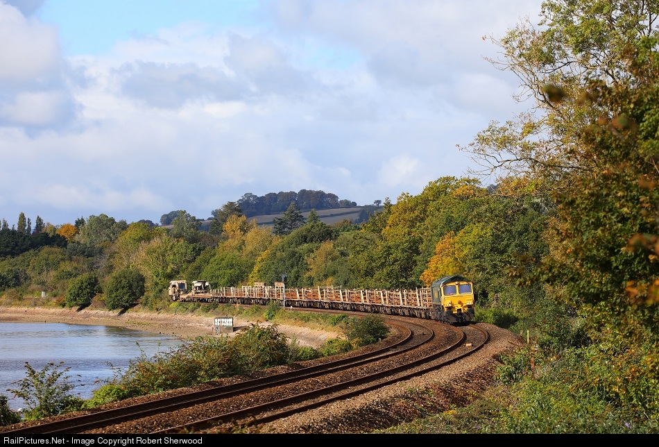 | 66508 skirts the banks of the River Teign near Bishopsteignton hauling 6Y97 07:55 Camborne to Westbury Down Yard on Sunday 11th October 2020 |