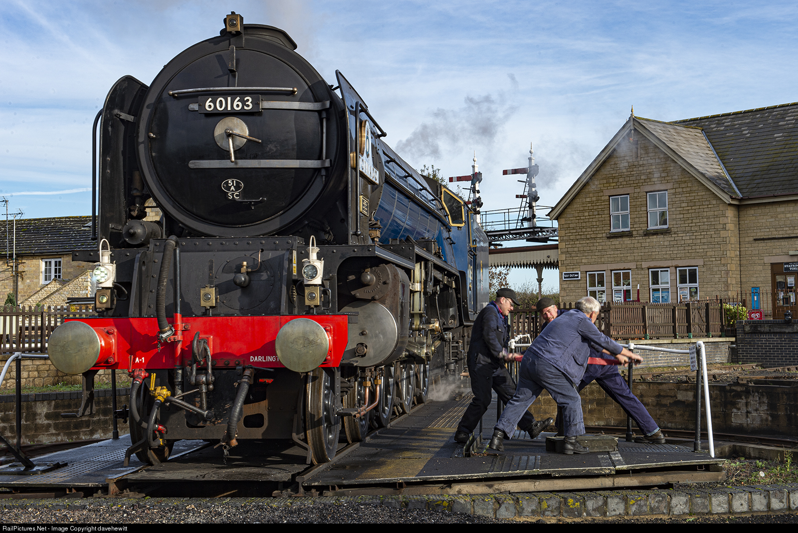 The Uk's newest mainline locomotive Tornado paid a visit to the Nene Valley railway in 2013. There was a need to turn the engine and this had to be done manually. Three volunteers work hard at turning the wheel which enables the turntable to revolve. There were a few automated turntables in the UK but I do not think that any have survived