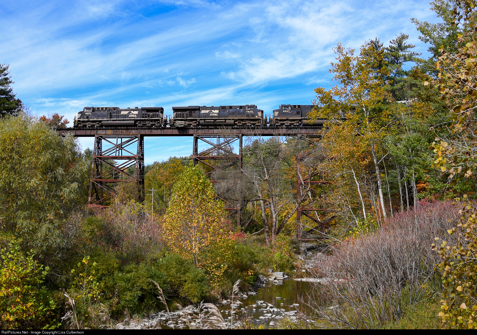 | The NS 23k rolls south across the High Bridge Trestle in Harpursville, NY. Over time, the trees have encroached on this bridge to point where this shot will probably no longer be possible within a few years. |
