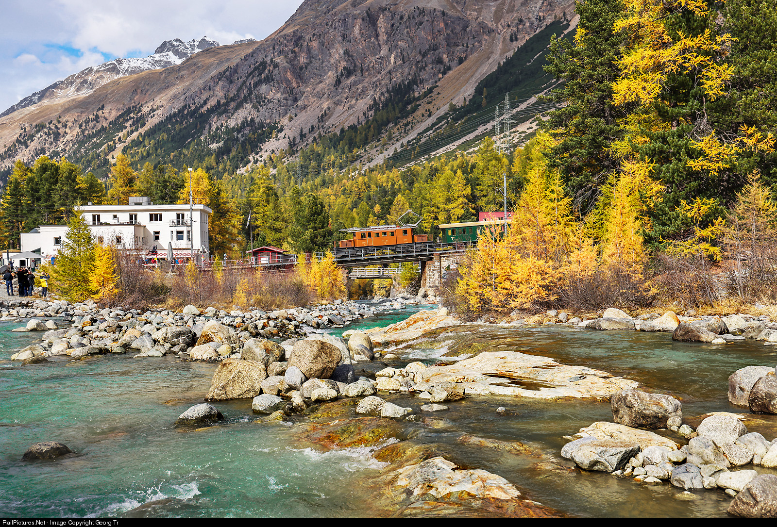 | The "Bernina Crocodile" Ge 4/4 # 182 of the Rhaetian Railway, built in 1927 by SLM and SAAS for the then independent Bernina Railway, is crossing the Ova da Morteratsch, when entering the station with the same name. This was a R.M. "FairFoto" charter train. |