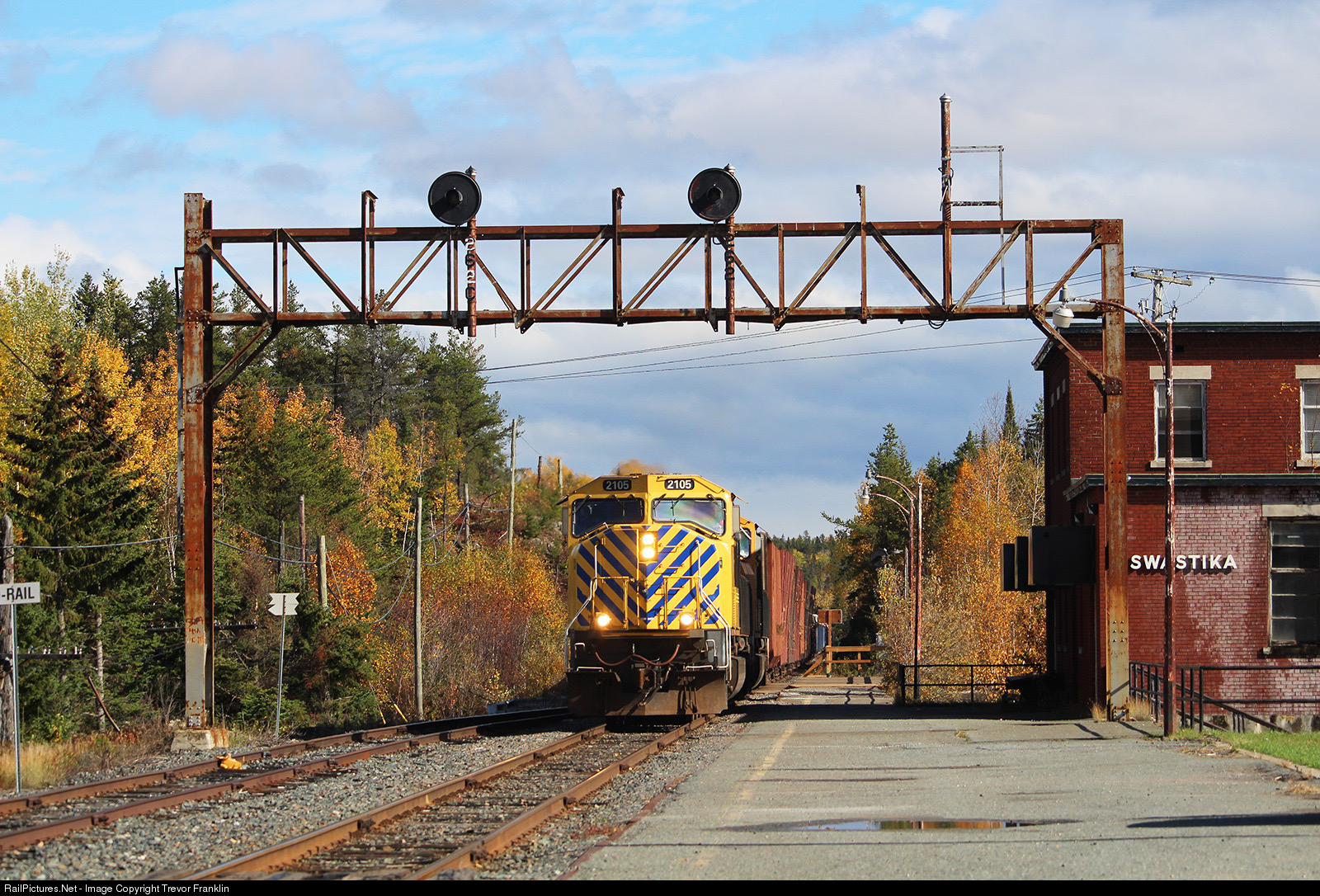| The rusty red infrastructure and colourful fall leaves paint a vibrant picture on a sunny October afternoon at Swastika. Here 211 is seen backing its train up past the junction so it can head east on the Kirkland Lake subdivision after working cars in the backtrack north of the station. |
