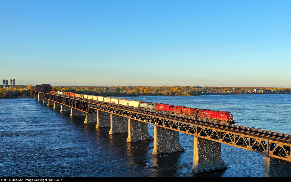 Canadian Pacific 251 is crossing the St Lawrence River as it approaches the Island of Montreal at sunrise. Visible in the background is the Seaway Lift Bridge at Kahnawake.