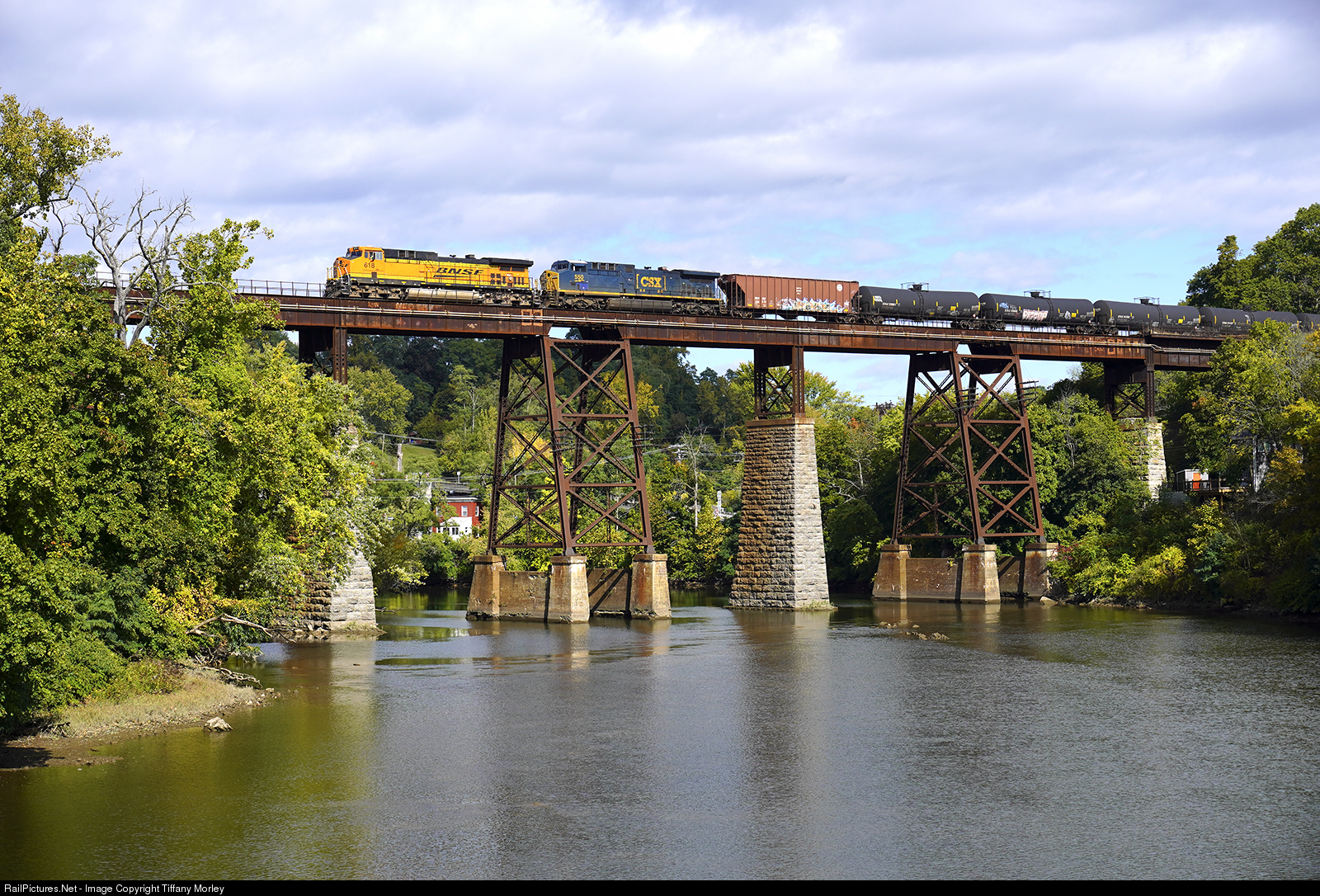 An oil train with a fresh crew crosses the Catskill trestle and heads South for New Jersey on a cool Friday fall morning.