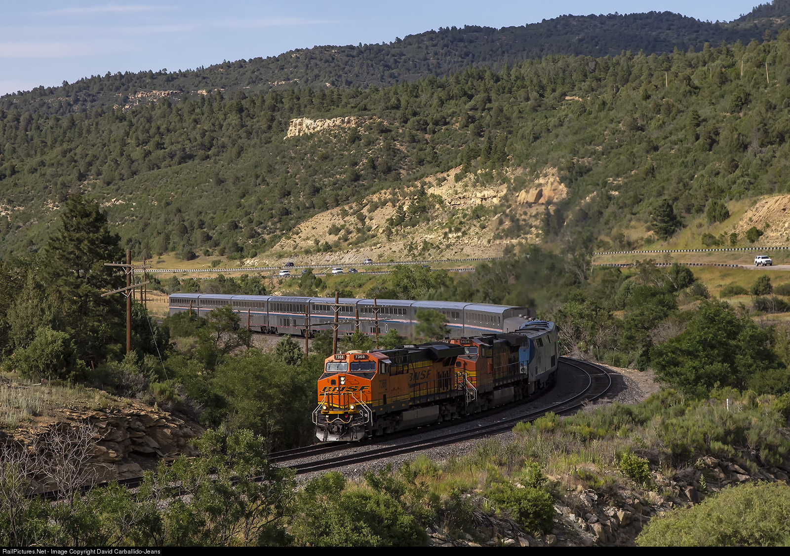After one of Amtrak's P42 motors died, a BNSF motor was added to the point to help the train across its LA trip. Then coming into Dodge City, KS, the BNSF motor died resulting in two BNSF motors leading the train. Here, the "overpowered" Southwest Chief climbs the grade of Raton Pass after performing the station stop in Trinidad, CO.