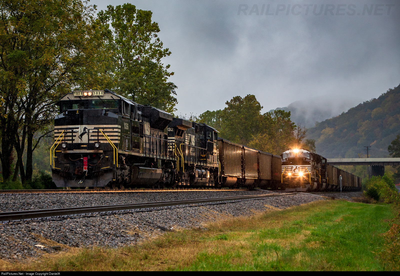 The rear end of loaded coal train NS 744 rushes past westbound NS 821 that sits in the siding at control point Kumis on the Whitethorne Distirct. 1036 is the ACe that was in the derailment with NS 4001.