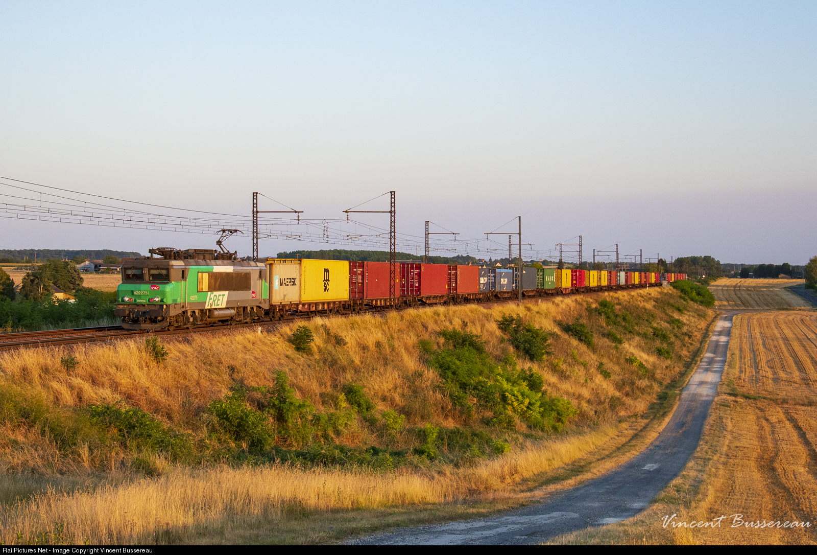 Evening light on the combined train Bordeaux -> Valenton passing through Touraine with the unique 22200 in FRET livery