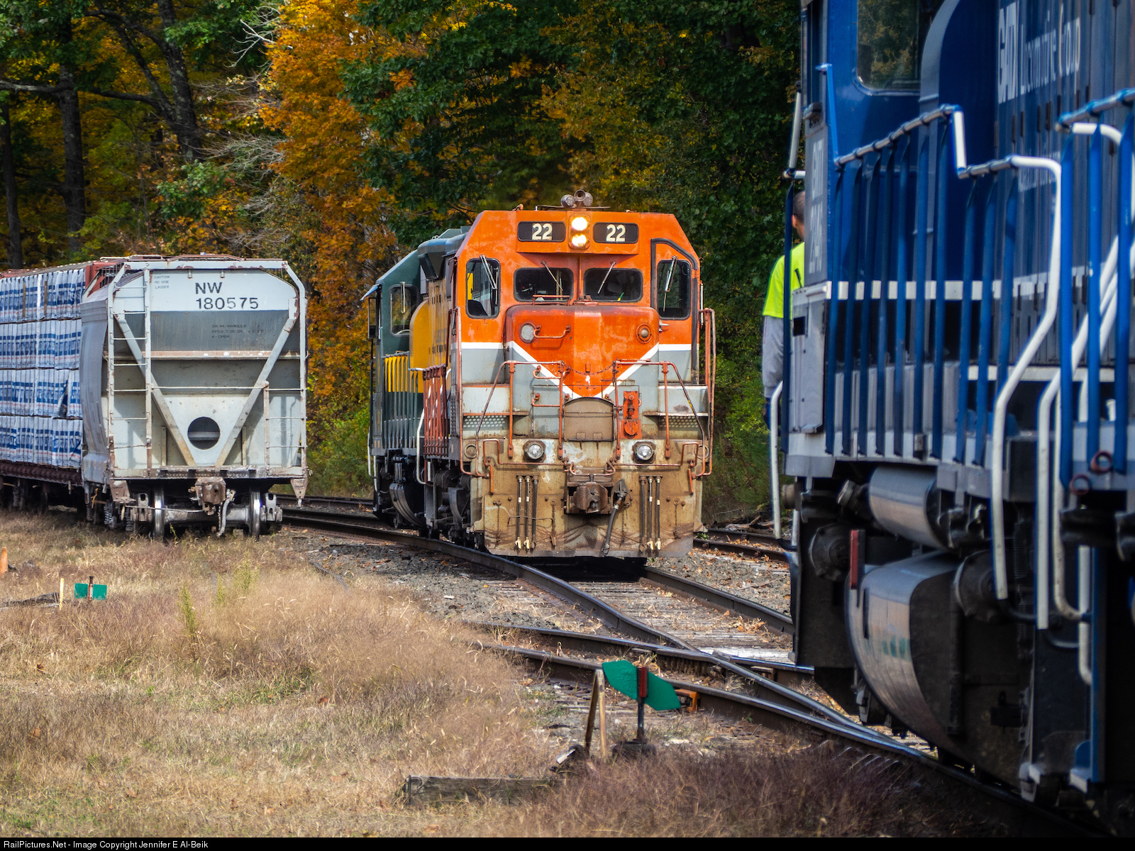 | Taking advantage of a sunny day in the Berkshires, I was fortunate to catch up to NX13 running light in Lee and then here at the museum in Lenox to pick up more power. They would then continue to Pittsfield to meet up with CSX. Here, the conductor uses hand signals to link up the GMTX leaser power to BAR 22 and HRRC 3600. |