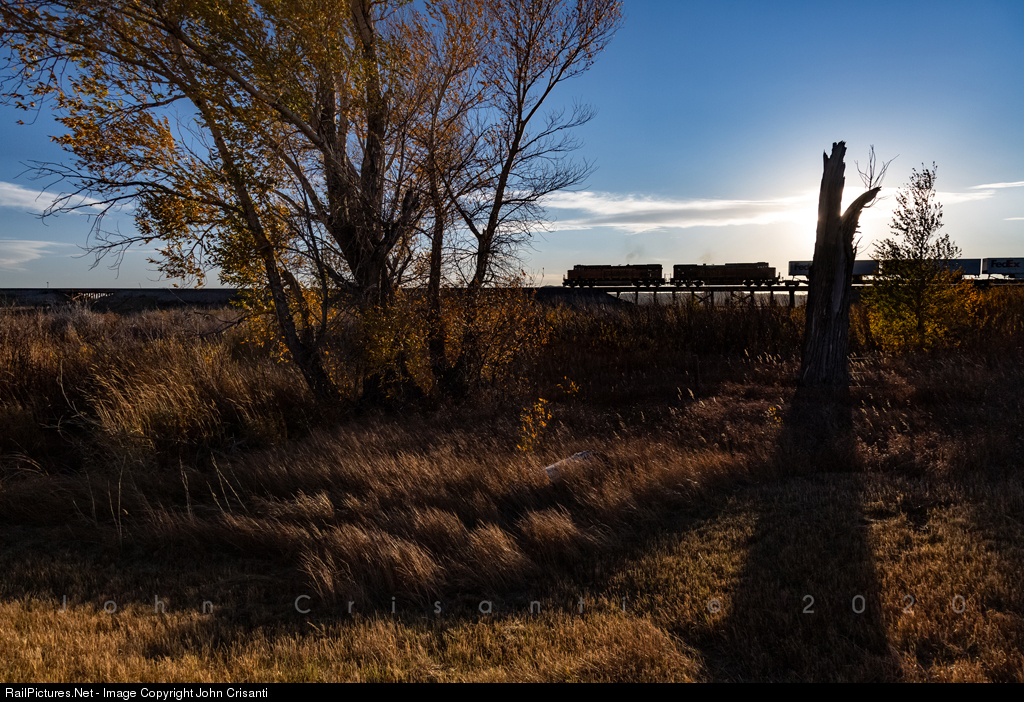 As the sun continues to lower in the late afternoon, a southbound BNSF intermodal reposition train crosses over the South Fork of Horse Creek in the small community of Horse Creek, Wyoming, on October 12, 2020.
