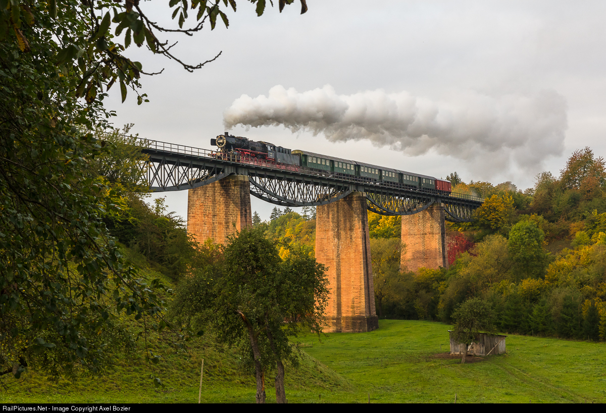 | 2-10-0 steam locomotive #52 988-3 (former #50 2988 built in 1942 at Wien Floridsdorf) is crossing the Fützen Viaduct on an early Fall morning. The Wutach Valley Railway ("Wutachtalbahn") is one of Germany's most spectacular museum railways. It is popularly known as the "pigtail line" ("Sauschwänzlebahn") due to its twisting route. |