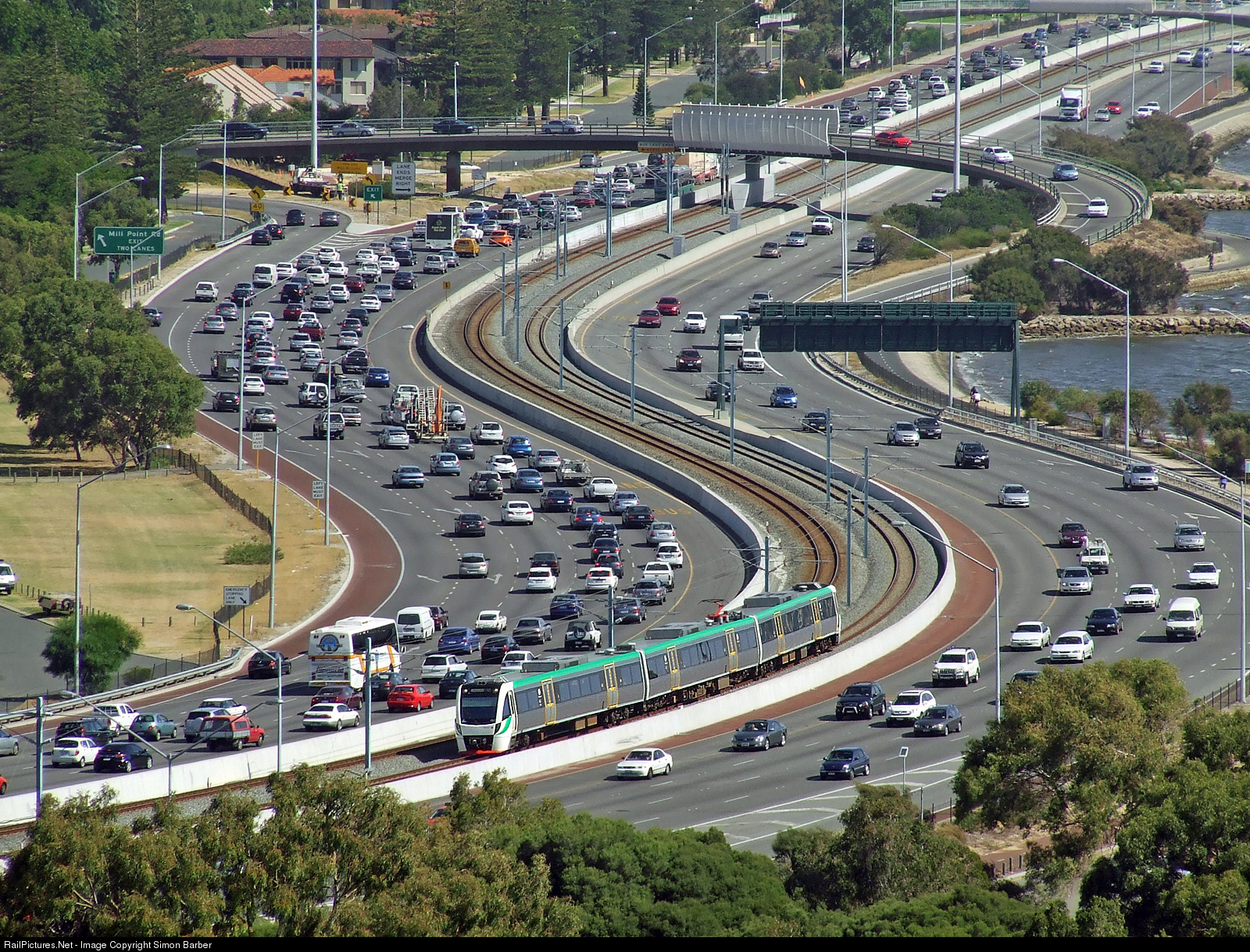 | A Transperth EMU set travels north on the Mandurah line, which follows the Canning River on the median of the Kwinana Freeway. |