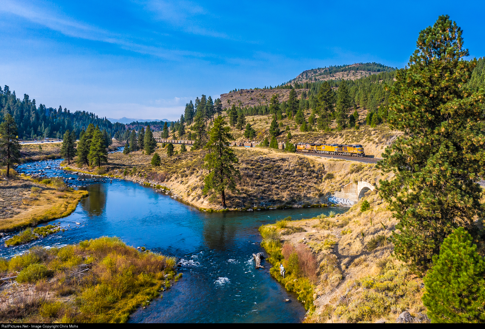 A couple of Fly fishermen work the confluence of the Truckee River and the Little Truckee River. An empty eastbound coal train with Union Pacific No. 6608 leading crosses the Little Truckee at Boca once a site for timber for the building of the Central Pacific Railroad.