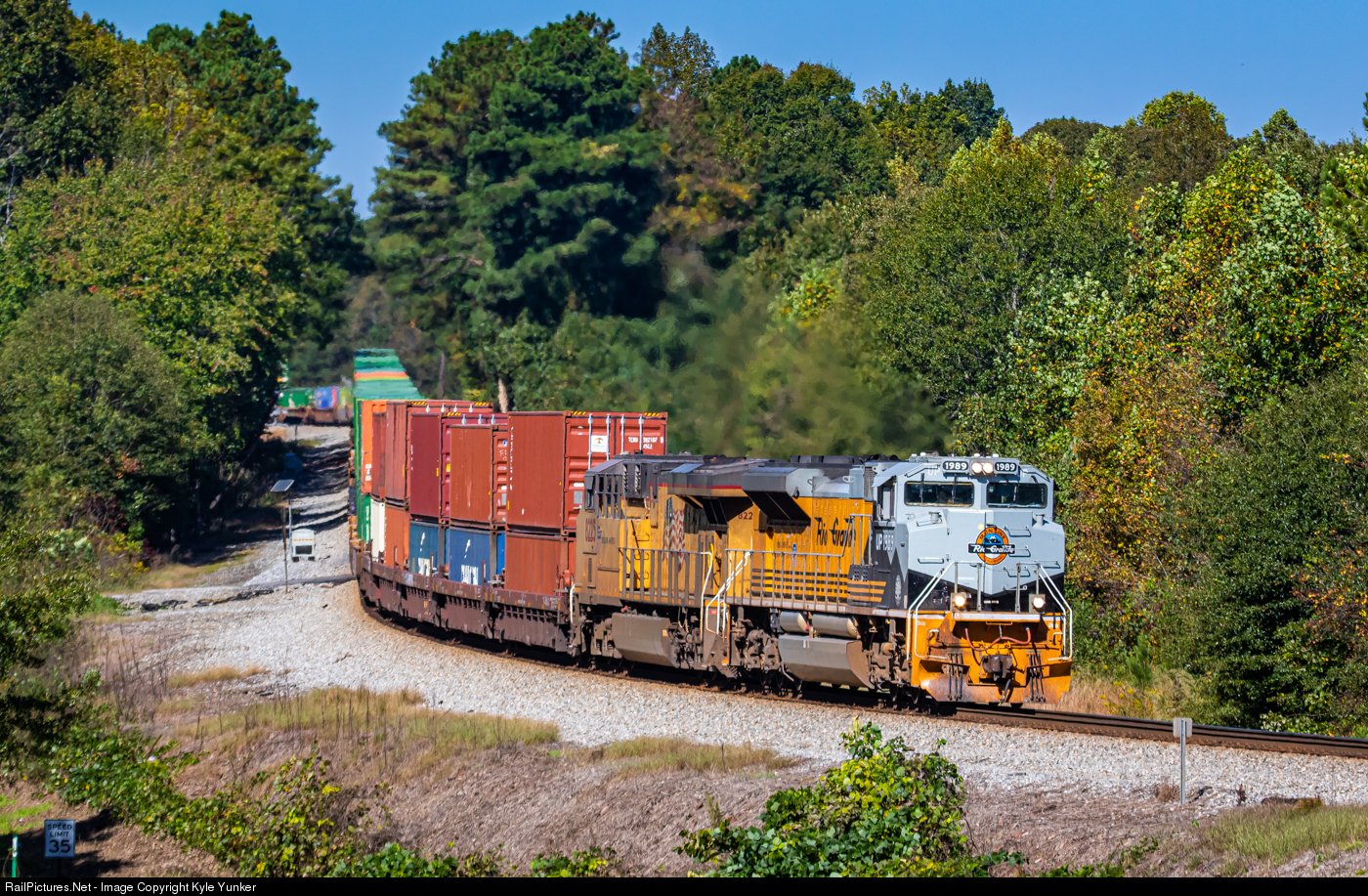 | Union Pacific's D&RGW heritage SD70ACe leads a Long Beach,CA - Atlanta,GA stack train through the hills of west Georgia nearing the end of its cross-country trek. |