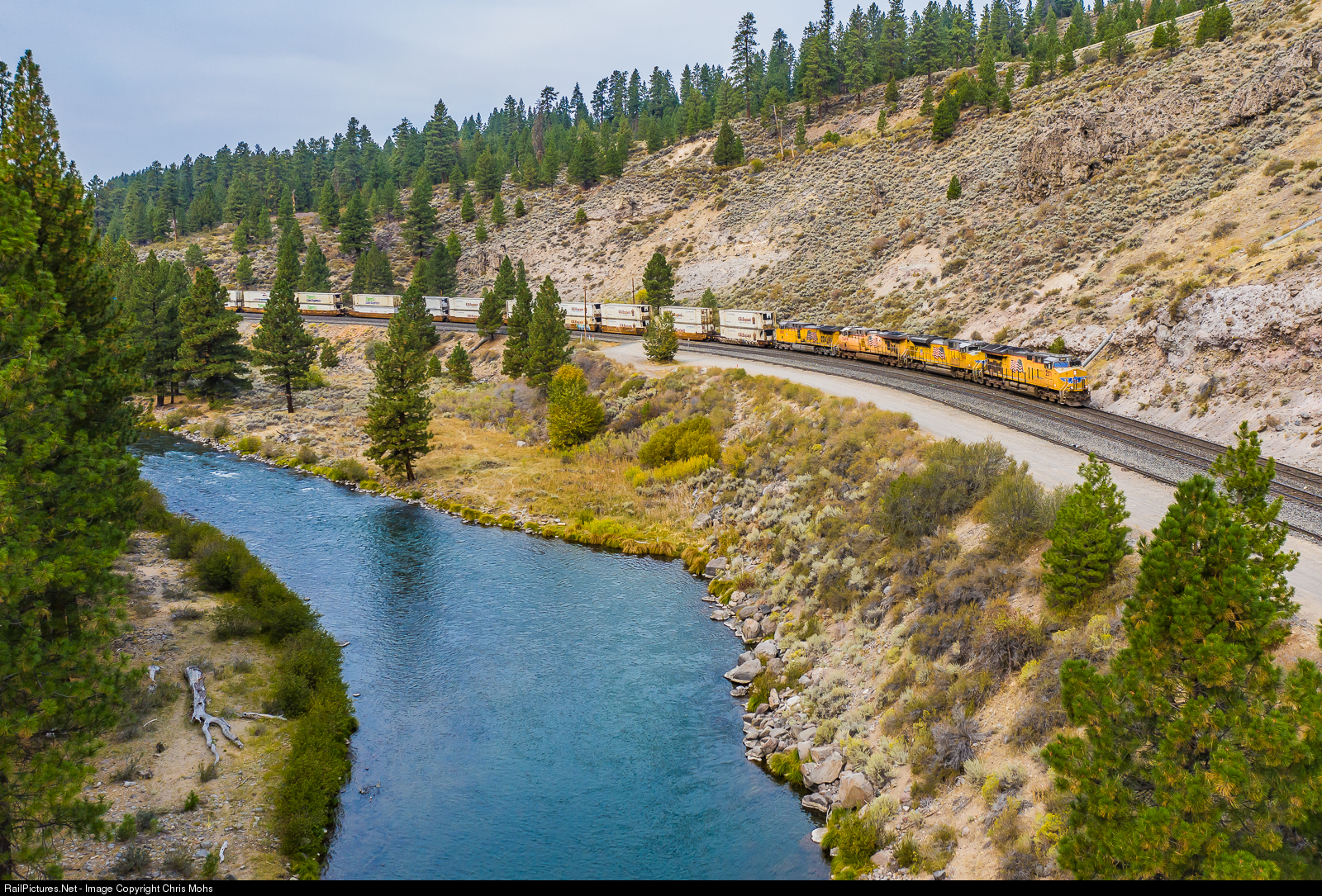 Union Pacific ET44AH no. 2571 and it's Stacks drop eastbound down the Truckee River Canyon to Nevada, leaving the Sierra Nevada Mountains and Donner Pass in it's wake.