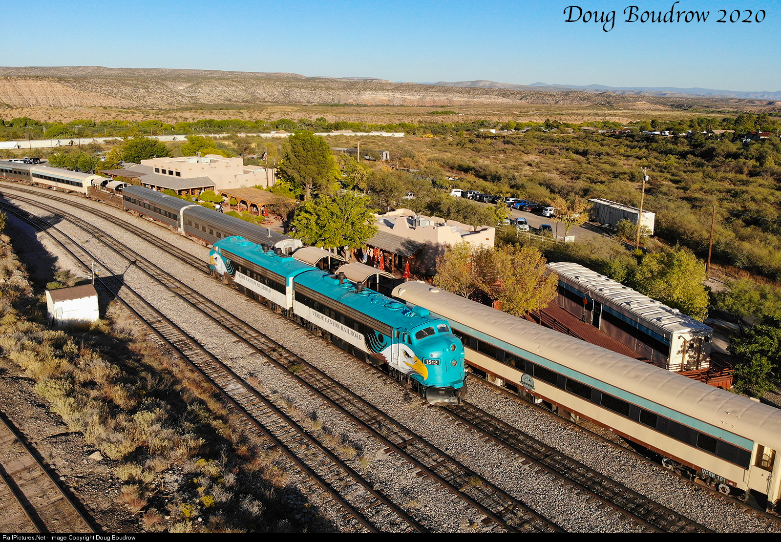 After a trip to Perkinsille and return, the Verde Canyon Railroad's pair of 1953 former Alaska Railroad FP7s are running around the train at their Clarkdale depot.