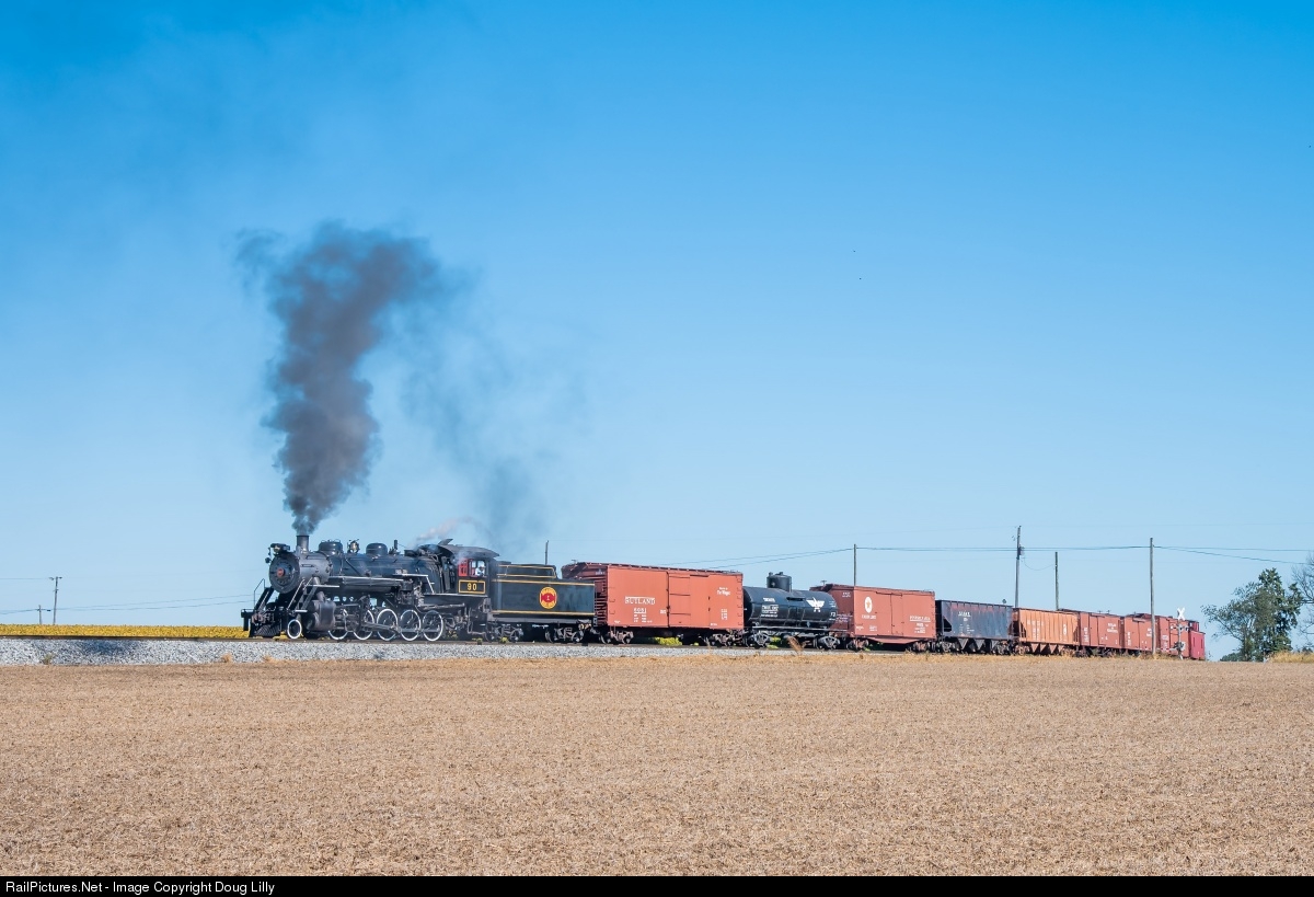 I took a ride over the Strasburg today to try and get some steam in Fall colors. I stumbled into a photo excursion that I didn’t know about, with 475 on the regular trains, and 89 and 90 working the charter. Seeing 2-10-0 90 sparked a lot of fond memories from the 1970’s and 1980’s, with the oval logo, yellow tender pinstriping, white running board edges, and white “American Flyer driver tires. Of course, they didn't extend her firebox to its original lignite-burning configuration. Here 90 powers the photo freight backing across Esbenshade Road. Taken from private property with permission.