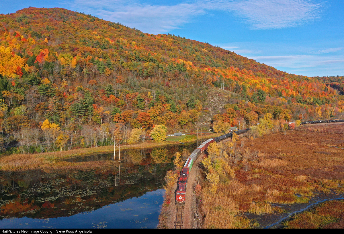 Canadian Pacific train 252 approaches the Bridge Road at Crown Point, the fall colors in the Adirondack foothills still looking good as they hang on longer along Lake Champlain. CP 8737 CP 8045.