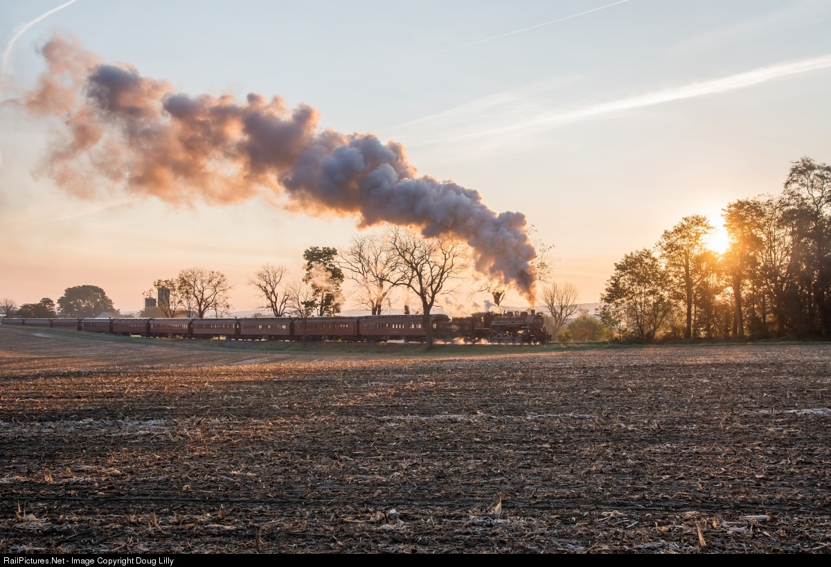 Strasburg decapod 90, sporting its pre-1983 paint scheme with the oval logo, storms upgrade between Cherry Valley and Esbenshade Road, as it begins a photo runby for its passengers at Verdant Valley Farm. As I understand it, the longtime Strasburg veteran will not reemerge from the shop in this paint. Taken from private property with permission.
