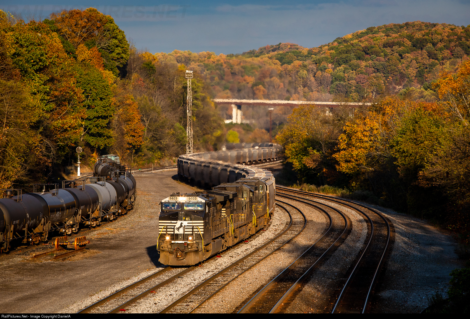 In some great evening sun and surrounded by beautiful fall colors, NS 51X slowly pulls into Bluefield yard with a dash-9 on point.