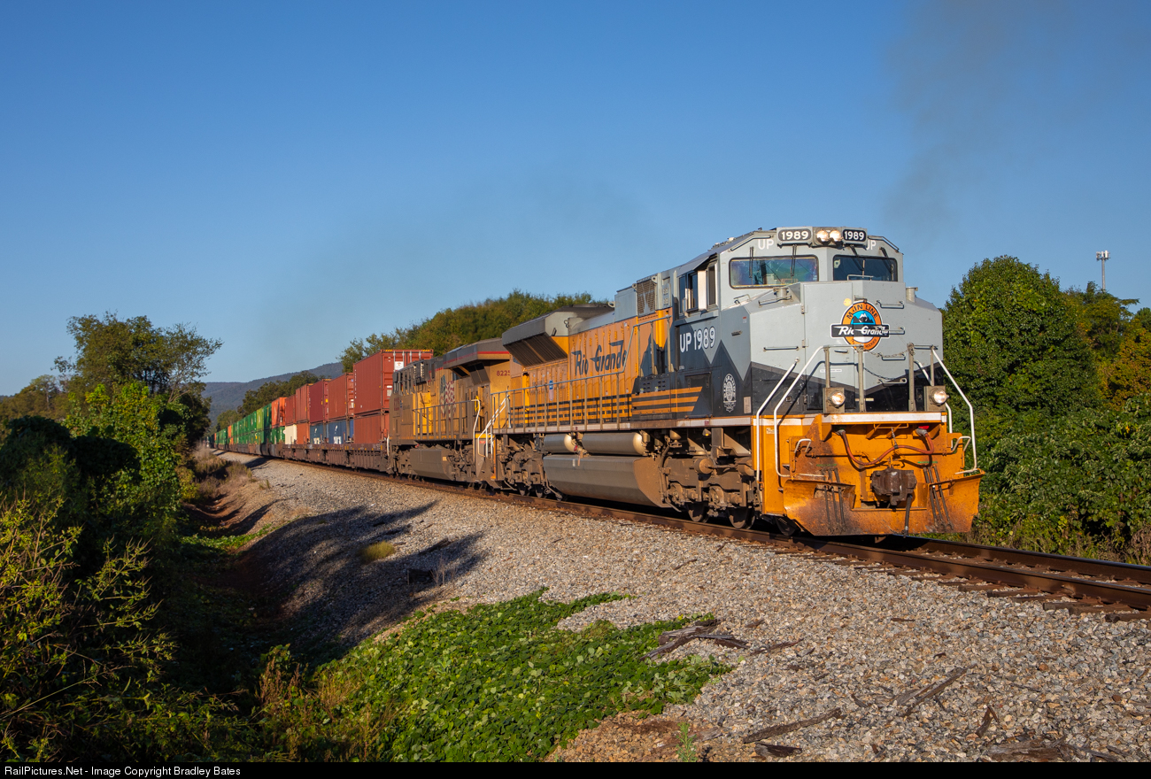 Union Pacific's Rio Grande Heritage SD70ACe locomotive #1989 leads Norfolk Southern Intermodal Train 22G east to Atlanta, GA., as they pass through Oxford, AL.