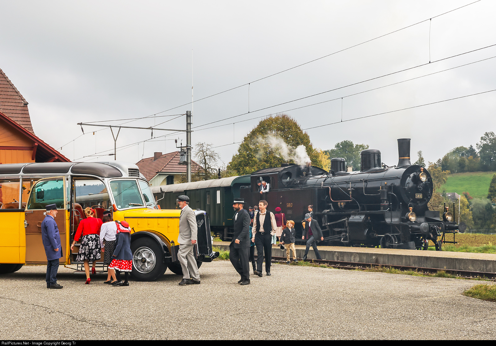 | A scene like in the 1950'/1960'. A steam train with the Eb 3/5 5810 has arrived in Häusernmoos on the Emmentalbahn, passengers transfer to the waiting "Saurer" snout post bus for the onward journey. A Peter Minder photo charter. |