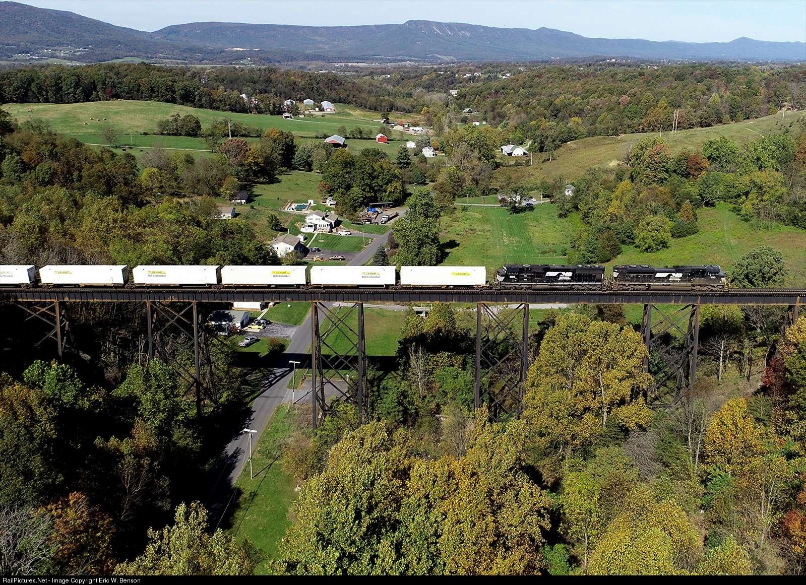 A late 202 makes a slow northbound move over the high trestle at Dovel Hollow as fall arrives in the Shenandoah Valley. #716