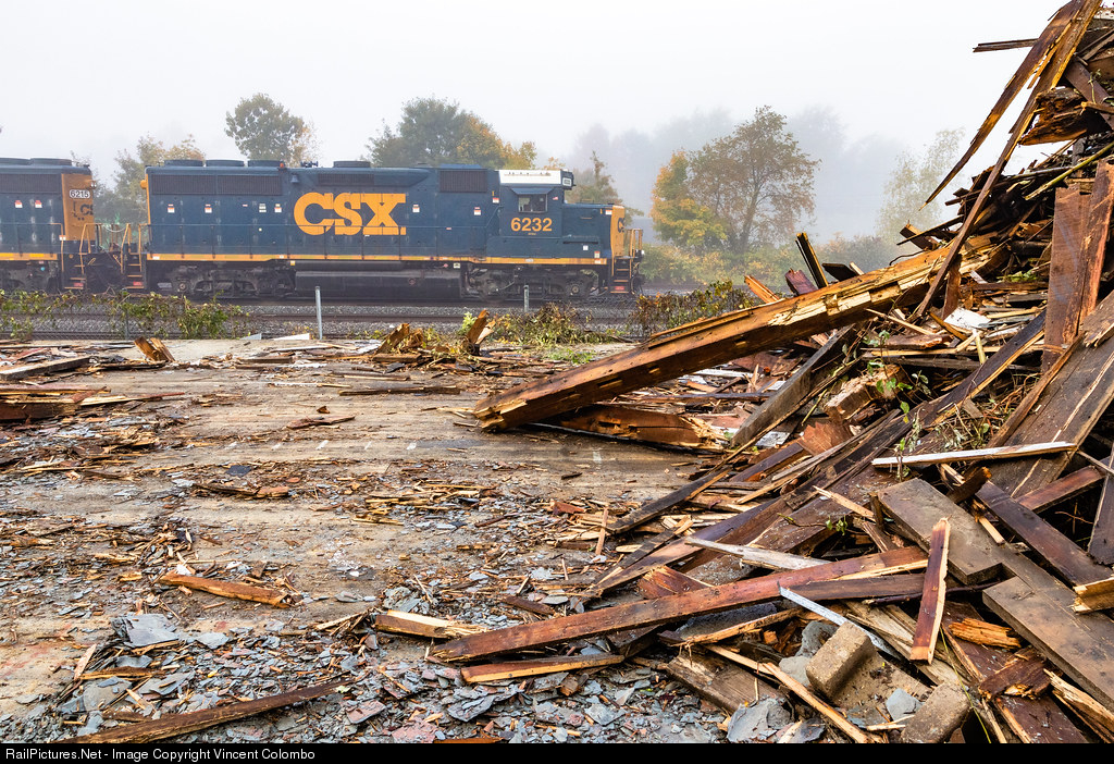 CSX 6232 and 6215 (GP40-2s) are sitting still and silent in CSX's Middleboro Yard on a rather foggy morning after handing train B729 last night. Adjacent to the yard stood a freight house up until early this week when a fire broke out in the south portion of the building, which was quickly extinguished. The following day, the rest of the building was knocked down, leaving only rubble remaining, seen here in the foreground.