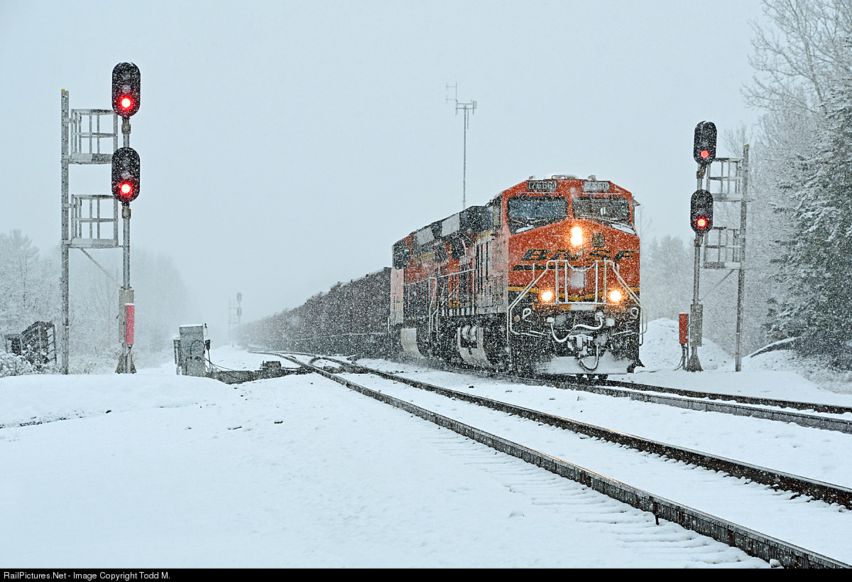 | Southbound BNSF 7566 with a CN crew splits the signals at Wolf, MN as they come off the CN Minntac Sub and onto the CN Missabe Sub with 130 cars of Granite City Works bound taconite pellets. |